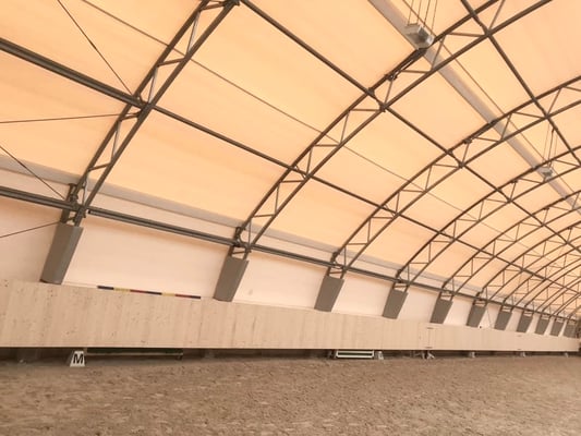 Unsere Halle wurde im Januar 2016 in Betrieb genommen. Die solide Stahlkonstruktion ist 10.40 m hoch und misst 25 x 60 Meter. Die helle Gewebeplane ist zu 90% lichtdurchlässig und lässt die Halle